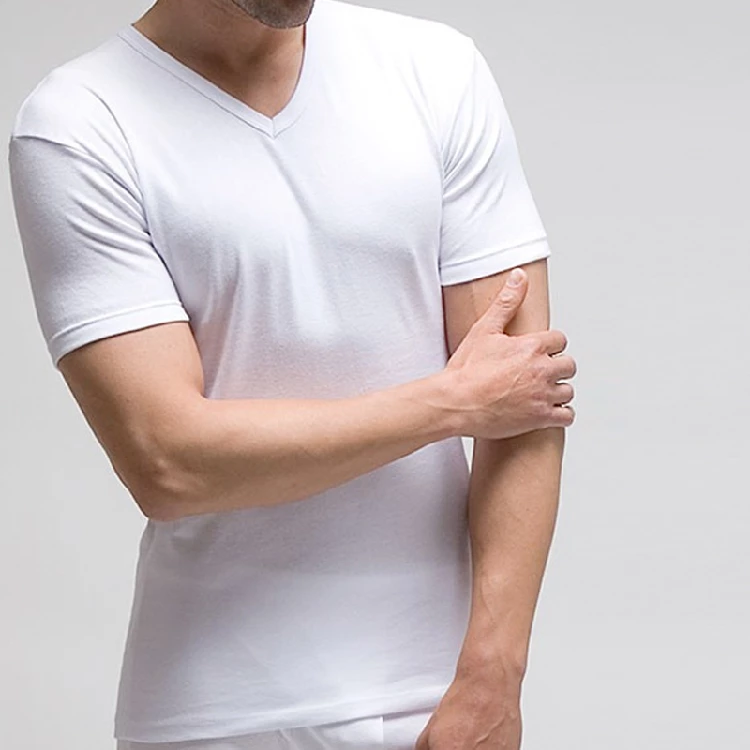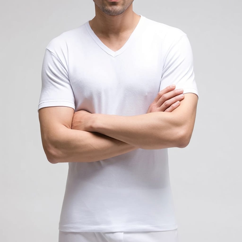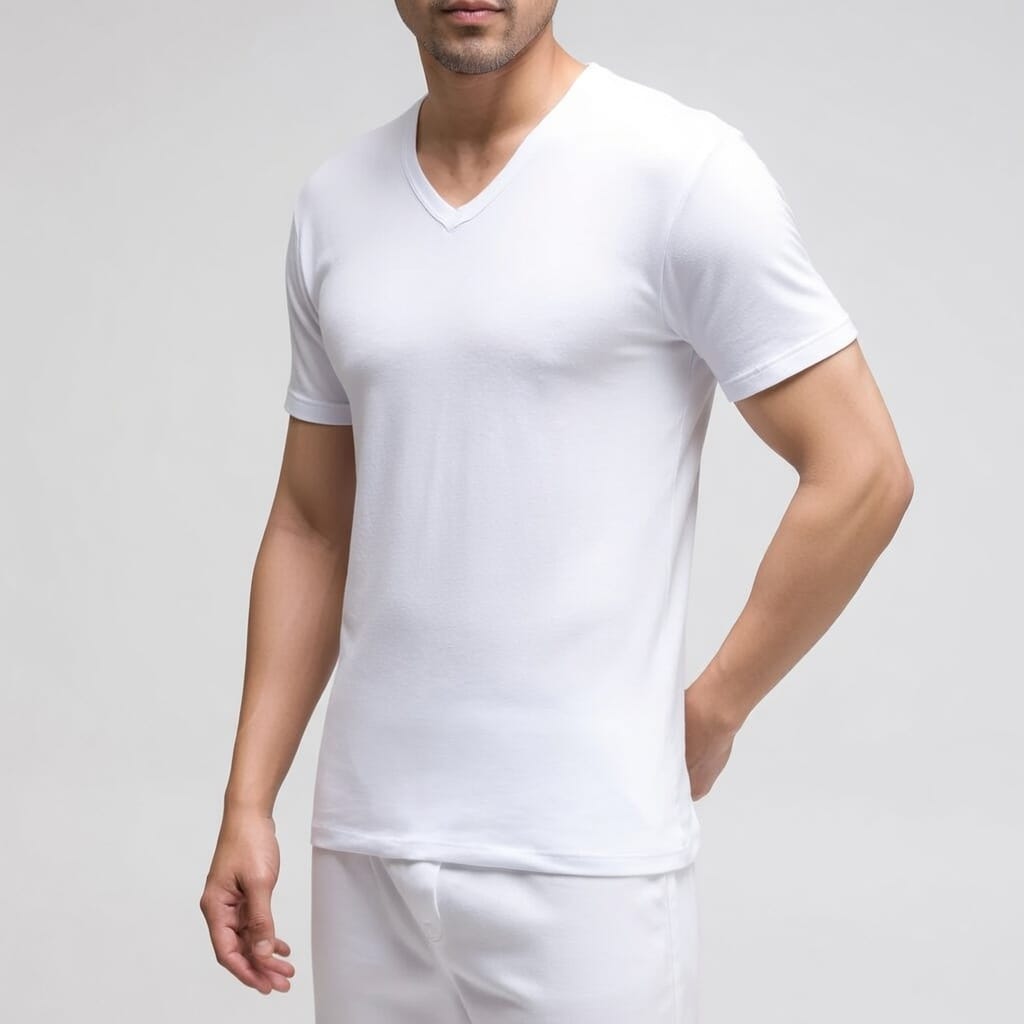 Su diseño clásico incluye manga corta y cuello de pico (V-neck), adaptándose perfectamente al cuerpo. Sin costuras laterales visibles, evita rozaduras y proporciona un acabado discreto bajo camisas, polos o cualquier outfit.